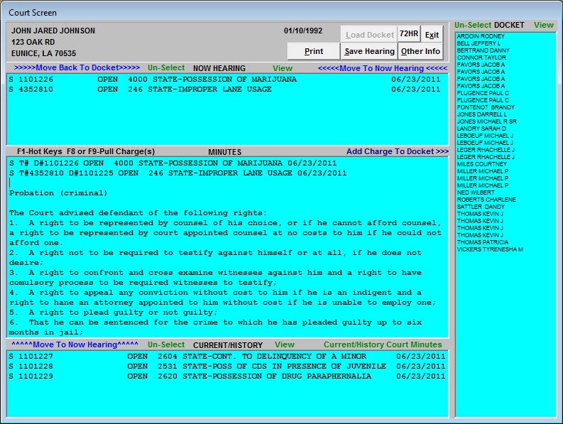 With it's highly interactive court docket Quick-Court enables the viewing of a full day's docket, including the defendants complete history and allows for the effortless transfer of multiple tickets and charges between workspaces. The Quick-Court System can create customized court minutes by using the hot-keys table. This fully interactive docket allows you to run court as quickly and confidently as possible.